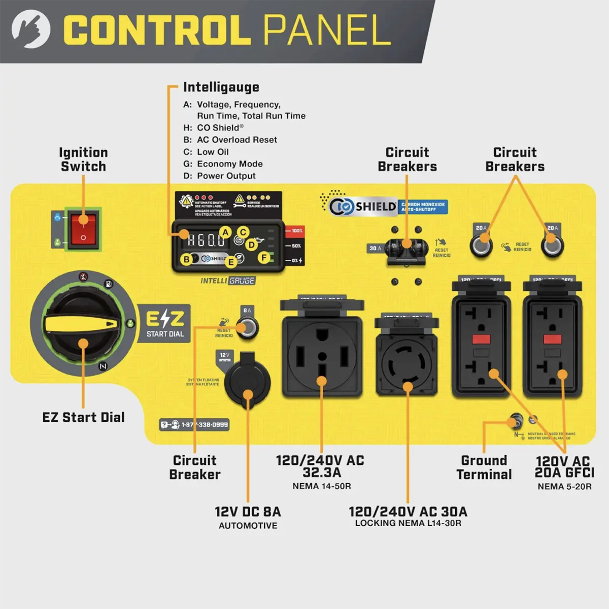 Intelligauge 5-mode display monitors voltage, frequency, run time, total hours, and power output