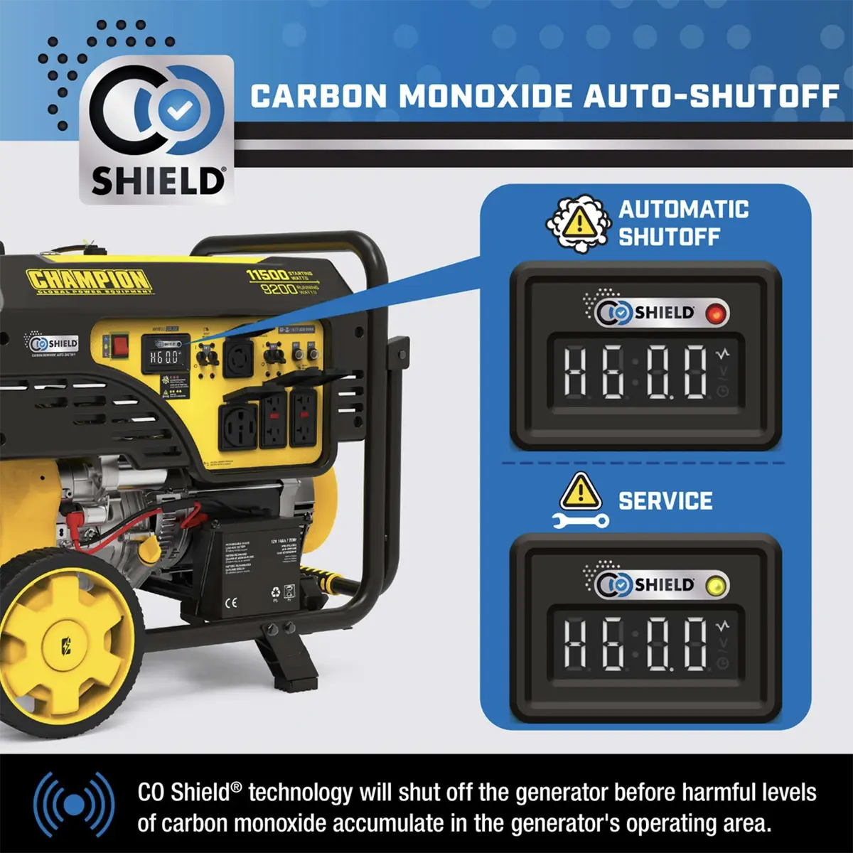 CO Shield automatically shuts down the generator if unsafe carbon monoxide levels are detected
